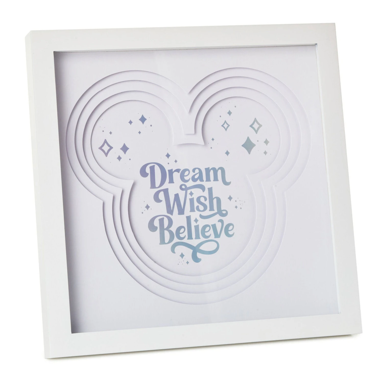 Be reminded to always dream, wish and believe, while sharing in Disney’s 100th anniversary, when you display this charming framed artwork. A silhouette of Mickey’s ears and inspirational words looks stunning in a layered die-cut design of pearlized and iridescent papers. The dimensional piece in a white wood frame makes a delightful gift for any Disney fan.