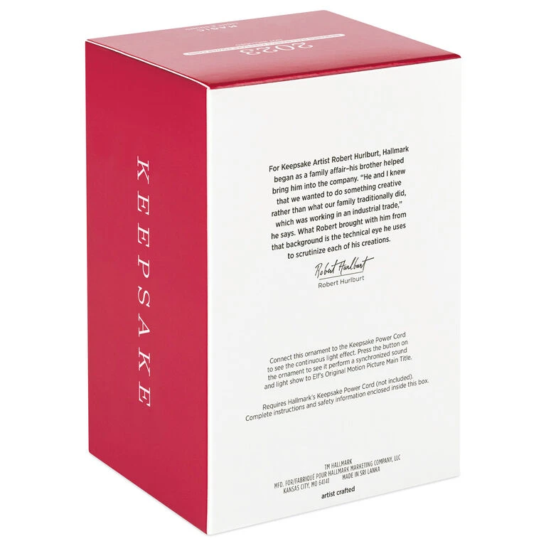 - Key Features: Connect this Magic Light and Sound ornament to Hallmark’s Keepsake Power Cord (sold separately) to see the continuous light effect. Press the button on the ornament to see it perform a synchronized sound and light show to the opening score of “Elf” the movie.