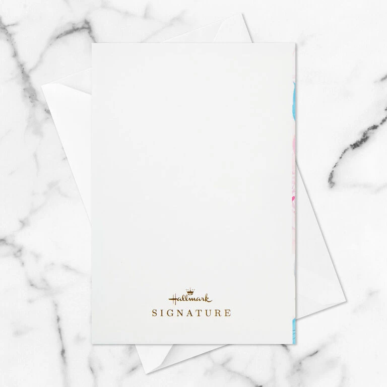 Pop-up love greeting card features a design of pink flowers with gold foil accents and a “love you” message on the front. Open the card to reveal the 3D pop-up surprise inside—no assembly required: an intricate, laser-cut pink lotus flower with glitter accents and green leaves and a loving message lettered in gold foil. This charming card crafted from premium card stock is a work of art sure to be displayed all year long, making it an unforgettable way to share the deep love you have for someone special on their birthday, anniversary, Valentine’s Day or anytime. When open, card lays flat for display; 3D pop-up inside measures approx. 2.13″ H.