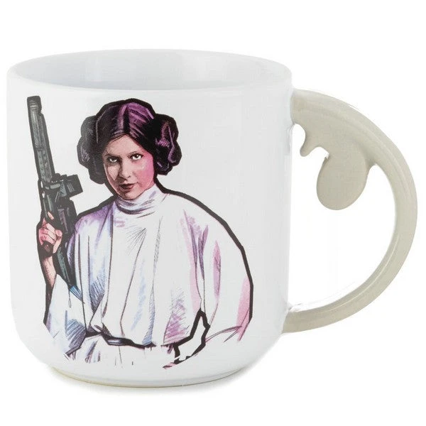 - Star Wars white ceramic mug features a Princess Leia design with embossed accents and a Rebel Alliance symbol sculpted handle.